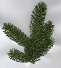 Aiguilles pointues, raides, piquantes, disposées tout autour du rameau; les quatre faces sont de couleur vert à vert-bleu. Cônes pendants, tombant en entier sur le sol :