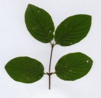 | Limbe mince, doux au toucher, vert foncé dessus, plus clair dessous; pétiole (= queue de la feuille) court. Feuilles opposées :