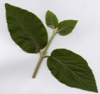 Bord du limbe doublement denté; surface du limbe gaufrée (= comme ondulée), vert foncé et lisse dessus; dessous plus clair et en partie velu; nervures secondaires non ramifiées (= non divisées) :