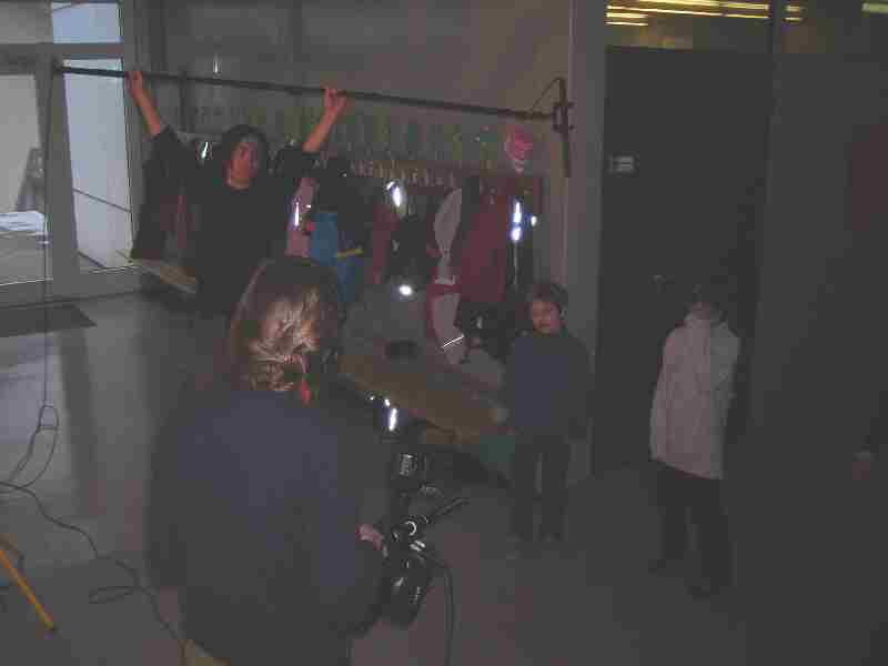 On a répété la première scène qui se passait dans les corridors. On a souvent dû tourner plusieurs fois la même scène parce qu’il y avait des enfants qui rigolaient, des gens qui passaient devant la caméra, du bruit dans les autres classes, parce qu’on ne savait plus notre texte ou encore parce que la phrase n’avait pas la bonne intonation.