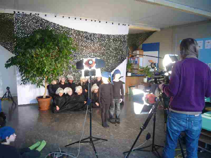 Le 18 février, c’était le jour du tournage. On était habillé en noir. On s’est échauffé en se « passant » de l’énergie. On a marché et couru de différentes manières et on a fait quelques exercices. Il y avait du matériel impressionnant : de grosses lumières qui faisaient mal aux yeux, un micro sur une perche, une grosse caméra, beaucoup de câbles et des costumes. Il y avait aussi un décor spécial. |