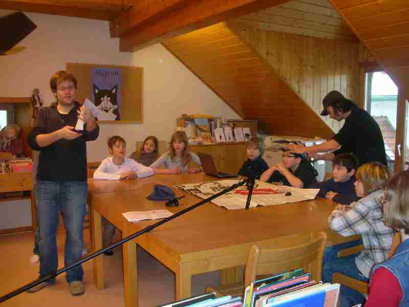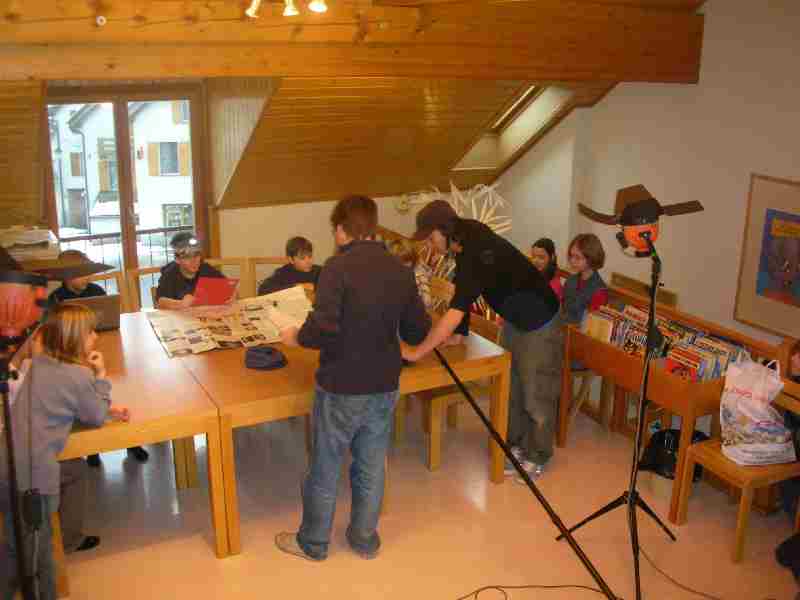 Nous avions rendez-vous à la bibliothèque de Gorgier à 8h15. Nous sommes montés les escaliers et nous avons vu les projecteurs. Et puis, nous avons commencé la première scène que nous avons dû recommencer plusieurs fois. Nous avons découvert le métier d'acteur et c'était fatigant. Nous avons eu une petite pause pendant laquelle nous nous sommes amusés. Ensuite, on est passé à la deuxième partie. A la fin, nous avons eu du retard ! Audrey, Kezia et Florence |